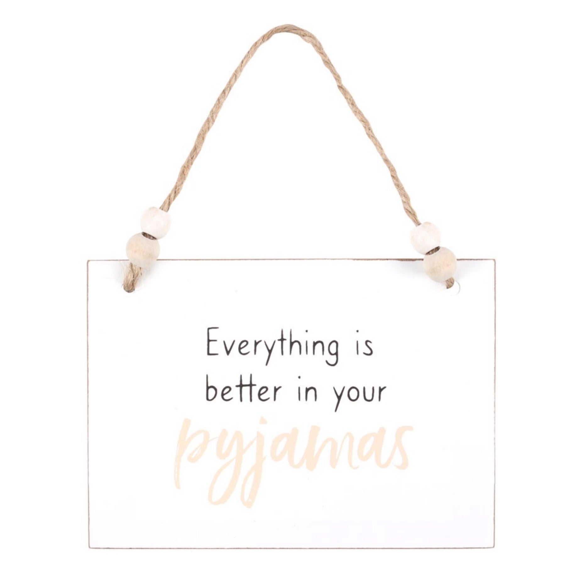 A light-hearted hanging sign perfect for any fun home. Features text that reads, 'Everything is better in your pyjamas' and finished with four wooden beads.
