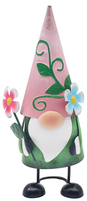 A cute green gnome decoration wearing a pink and leaf style hat, holding a single pink flower.