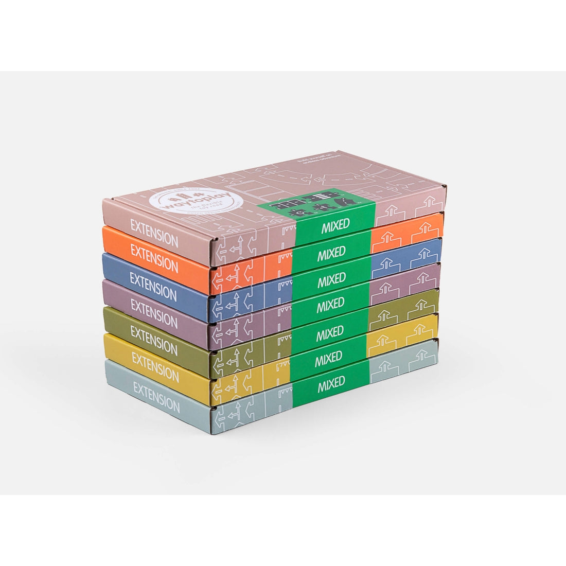 Waytoplay Mixed Extension Set with 8 road parts. This new expansion set contains eight road parts : four curves, two straight parts (pedestrian crossing and parking) and two crossed road parts. The waytoplay flexible road parts are printed on both sides. Put them between or beside your waytoplay roads for even more fun. You expand your waytoplay lay-out with eight road parts.