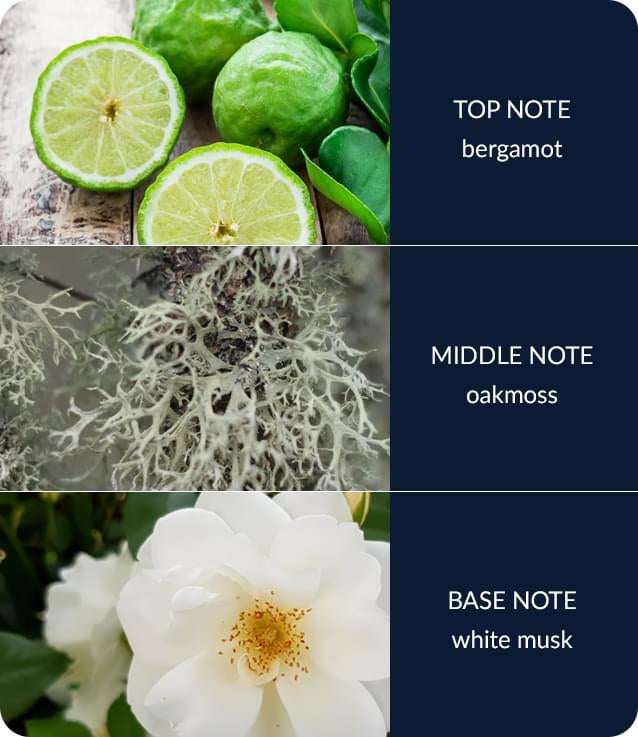 Soft white musk sits atop a rich base of lush bergamot layered with zesty citrus and touches of white pepper.