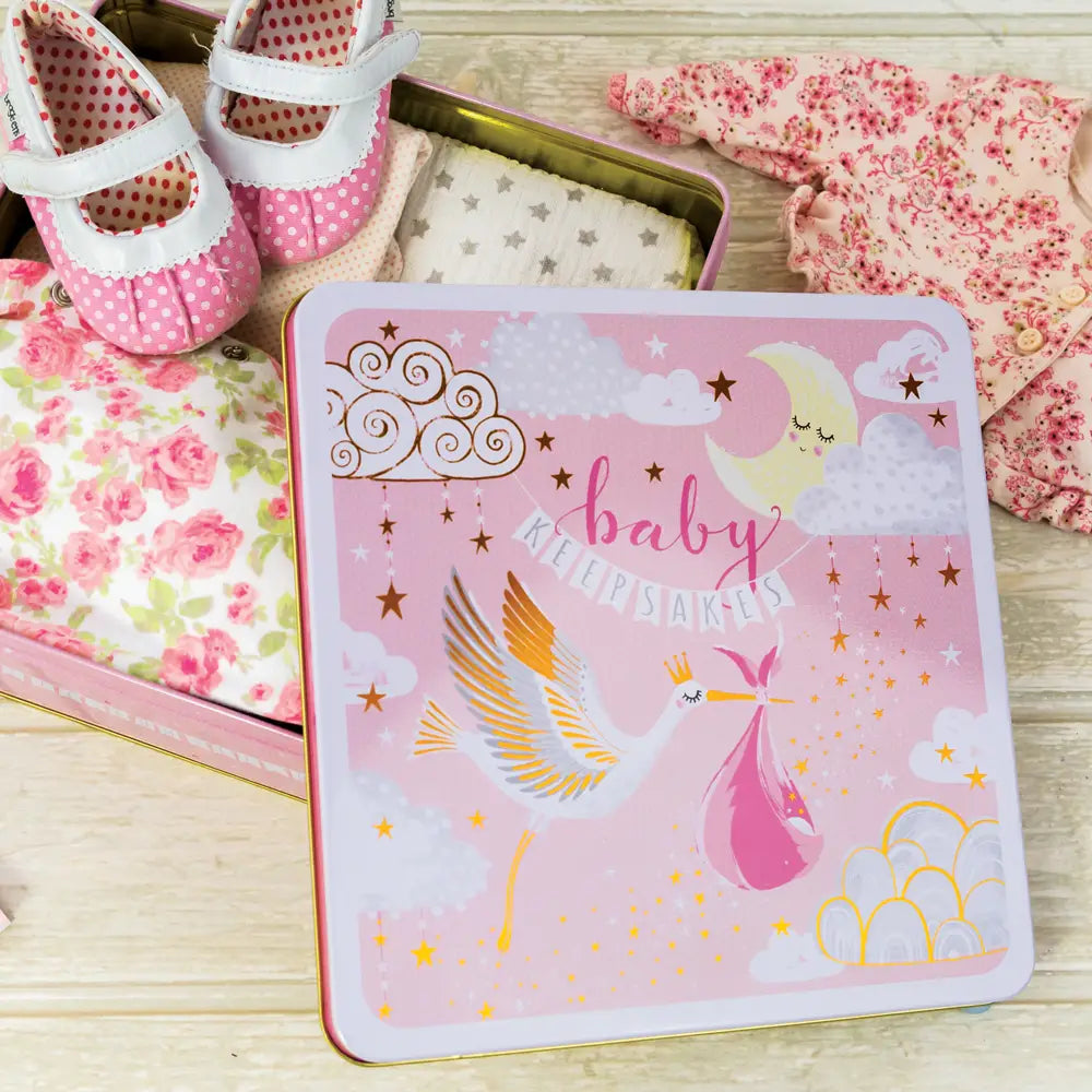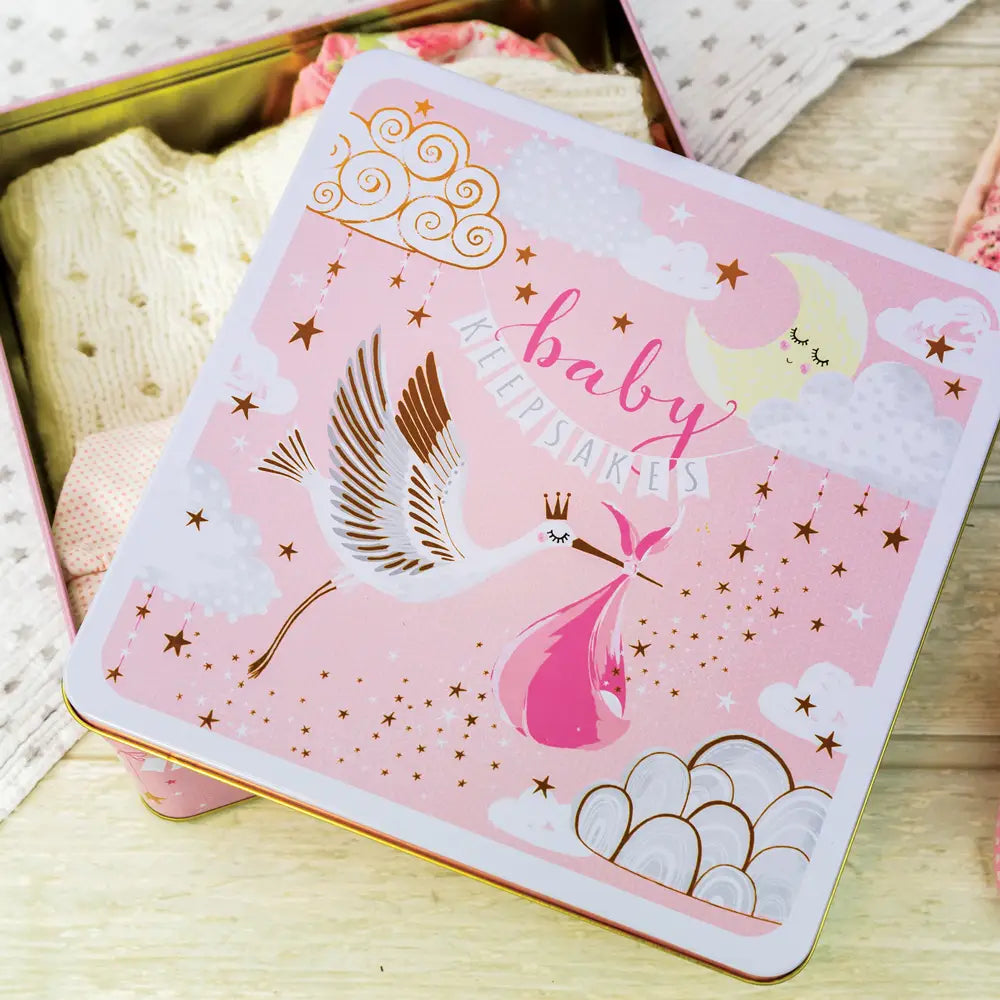 This large square baby girl keepsake storage tin features beautifully stylish artwork with gold foil highlights. It makes a perfect gift for baby showers or the birth of a baby girl and is both pretty and practical. The ideal size to store all those treasures and mementos of such a special life event for years to come. Size: 228mm x 228mm x 78mm.