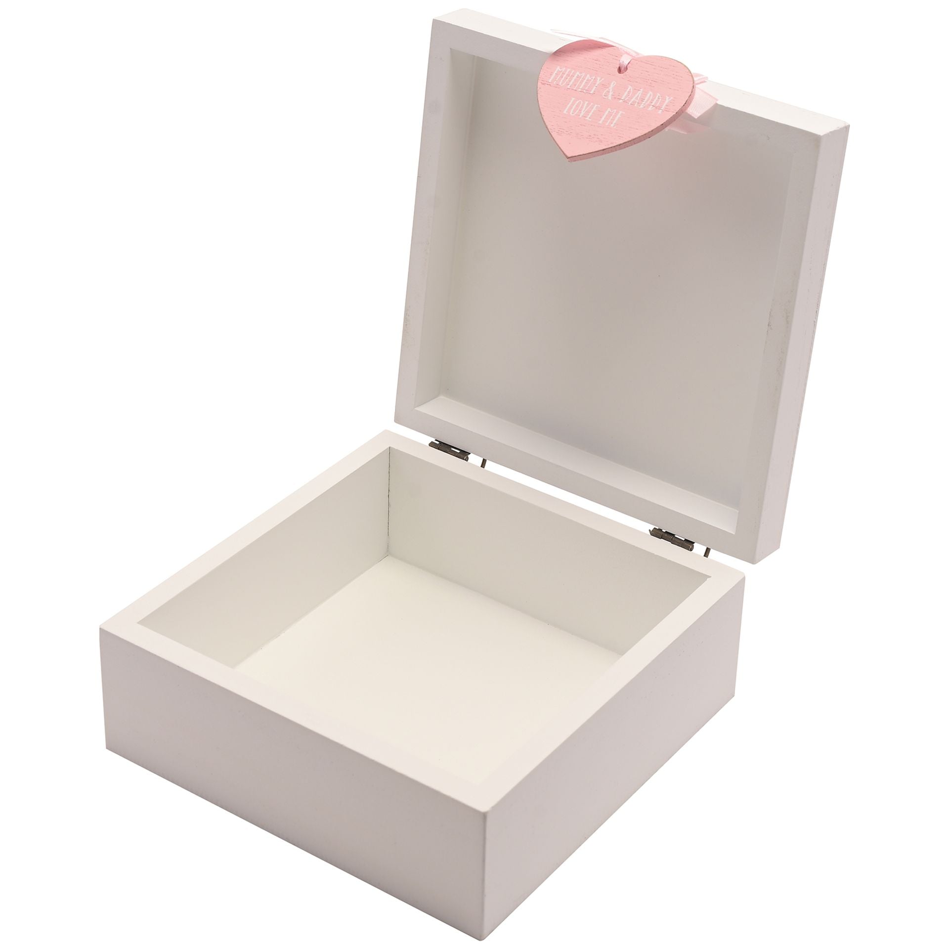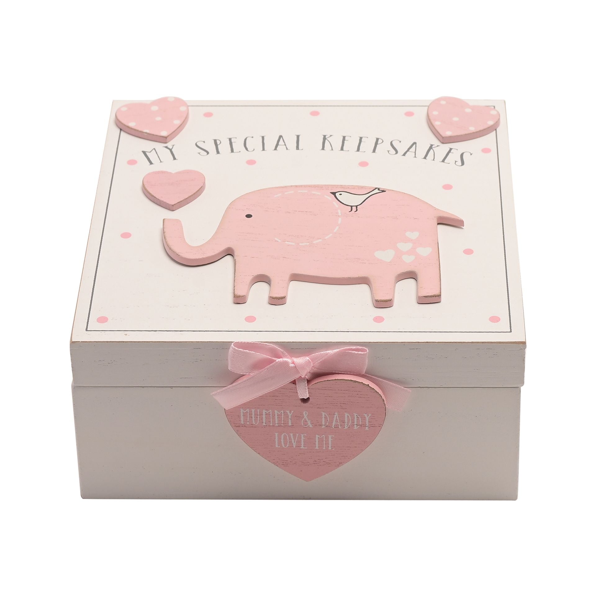 Preserve some precious memories and moments with this adorable distressed wooden baby's keepsakes box. From the Petit Cheri Collection by CELEBRATIONS® - vintage, rustic and utterly charming gifts for your little darling. Details: - Distressed whitewashed wooden box with pink polka dots - 3D pastel pink elephant character with bird and hearts decoration - MY SPECIAL KEEPSAKES title - Pastel pink 3D wooden hearts icon decorations - MUMMY & DADDY LOVE ME heart shaped clasp tag with pink satin ribbon - The perfect place to store photos, hospital bracelets, socks and other early keepsakes