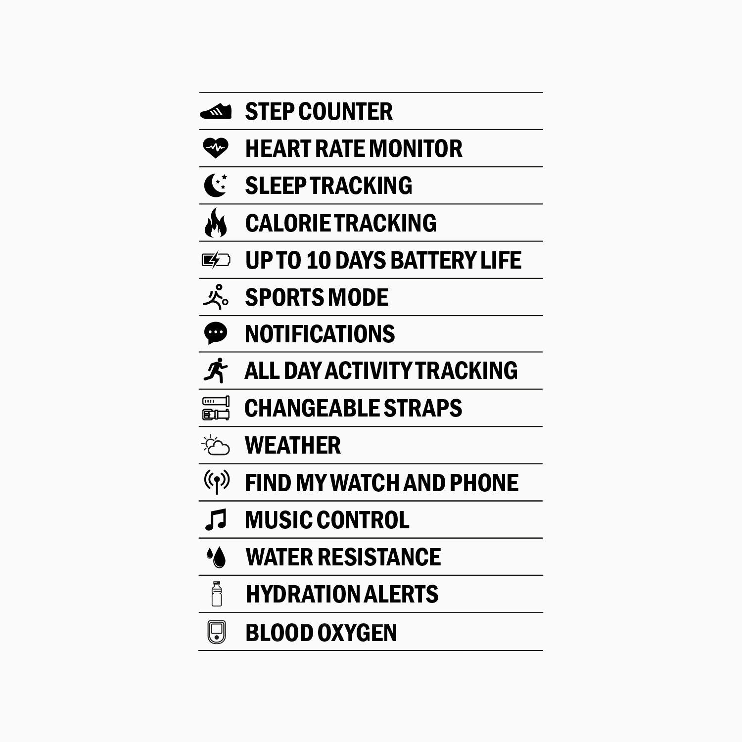 This Sekonda Track Smart Watch has a silver-grey plastic case with a 1.47 inch rectangular fully interactive touch screen. Features include a step/distance/calorie tracker, 8 sports modes, heart rate/blood oxygen monitors and message notifications. The watch is fastened with an interchangeable grey silicone strap with quick release spring bars and a water resistance rating of IP68. This means that the watch is splashproof but not recommended for swimming or watersports.