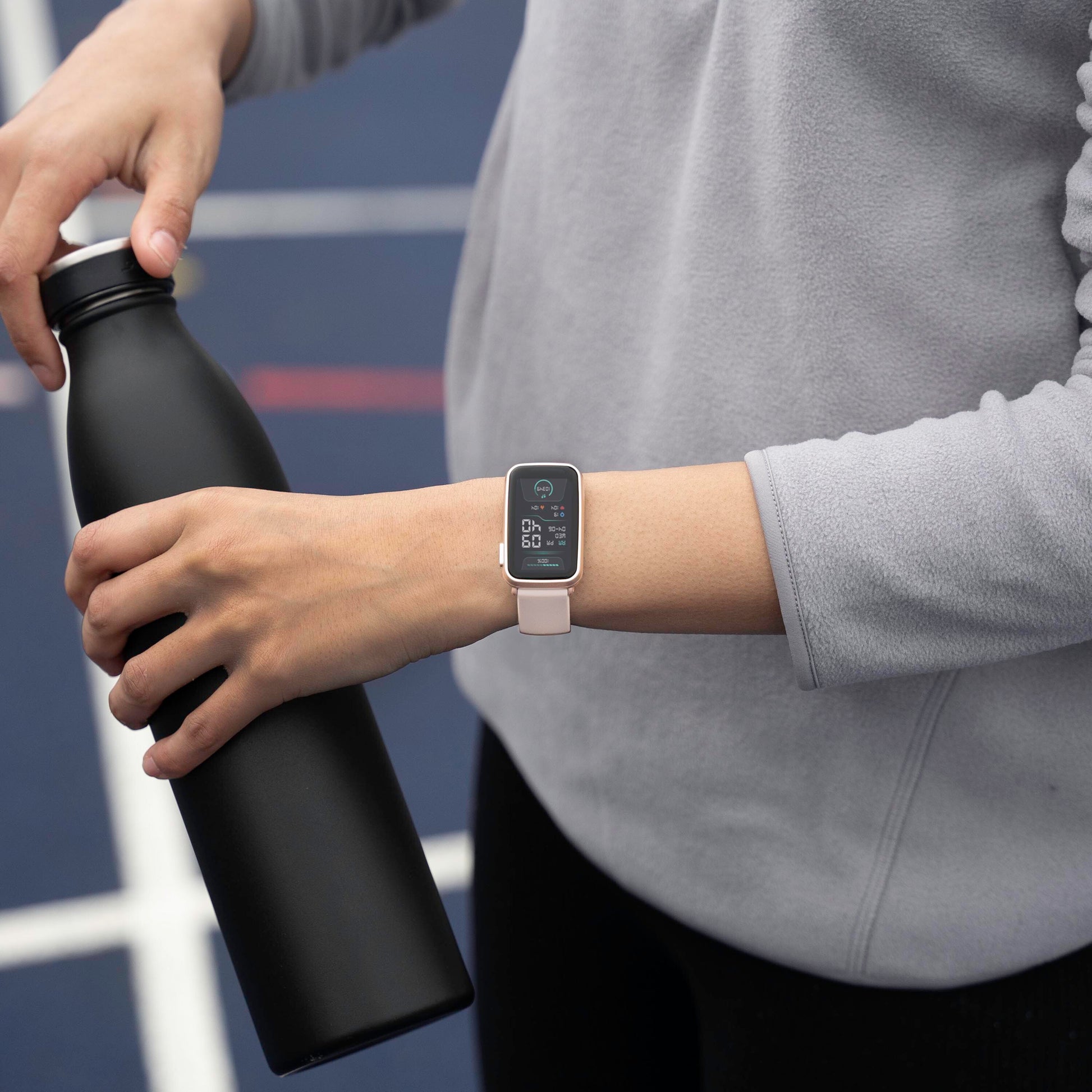- Rectangular rose gold plastic case with 1.47 inch fully interactive touch screen display