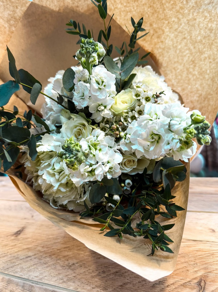 Beautiful hand tied bouquets by Lucky Blooms Florist at NEWMANS. Our Flossie bunch is A mix of beautiful hydrangeas, wild eucalyptus, roses & much more. Any enquires regarding colour or flower choice please don't hesitate to leave a note or give us a call!