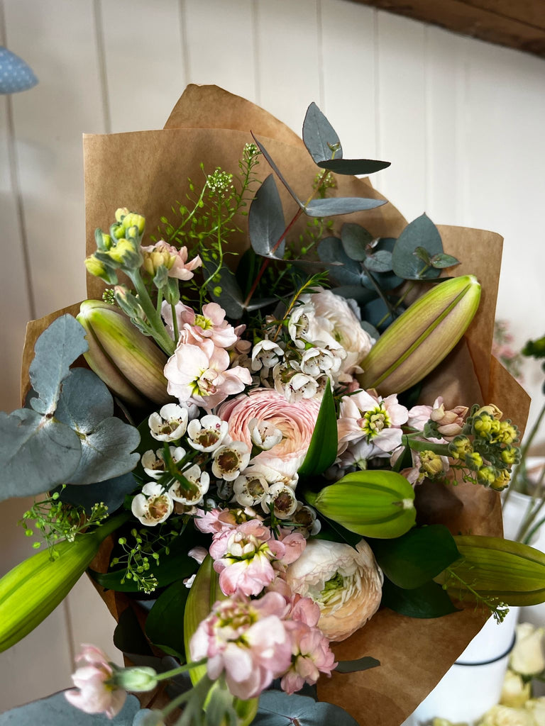 A twist on our classic florist choice bunch made up of the most gorgeous seasonal flowers as well as some Lily’s! Typically comes with lily's of course! Roses, greenery and more. Any enquires regarding colour or flower choice please don't hesitate to leave a note or give us a call!